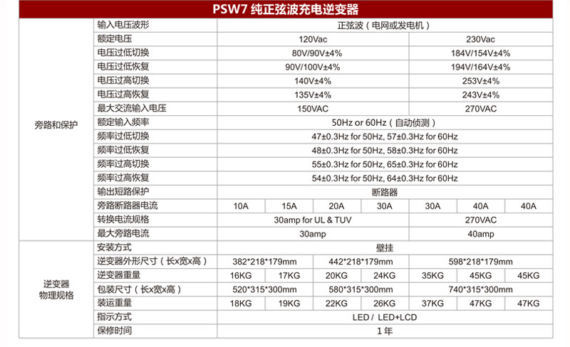 PSW7系列純正弦波逆變器集合逆變器,充電機和自動交流轉換開關為一體的多功能逆變器,轉換效率可高達88%。